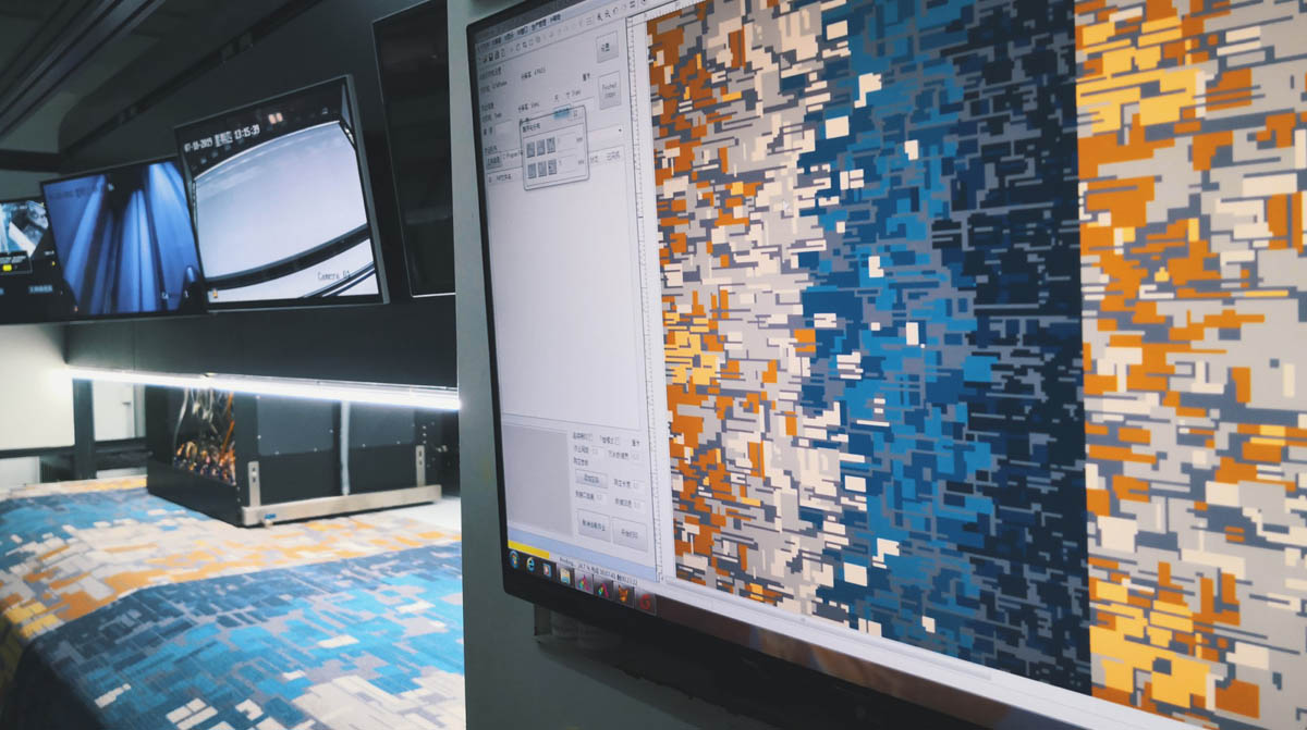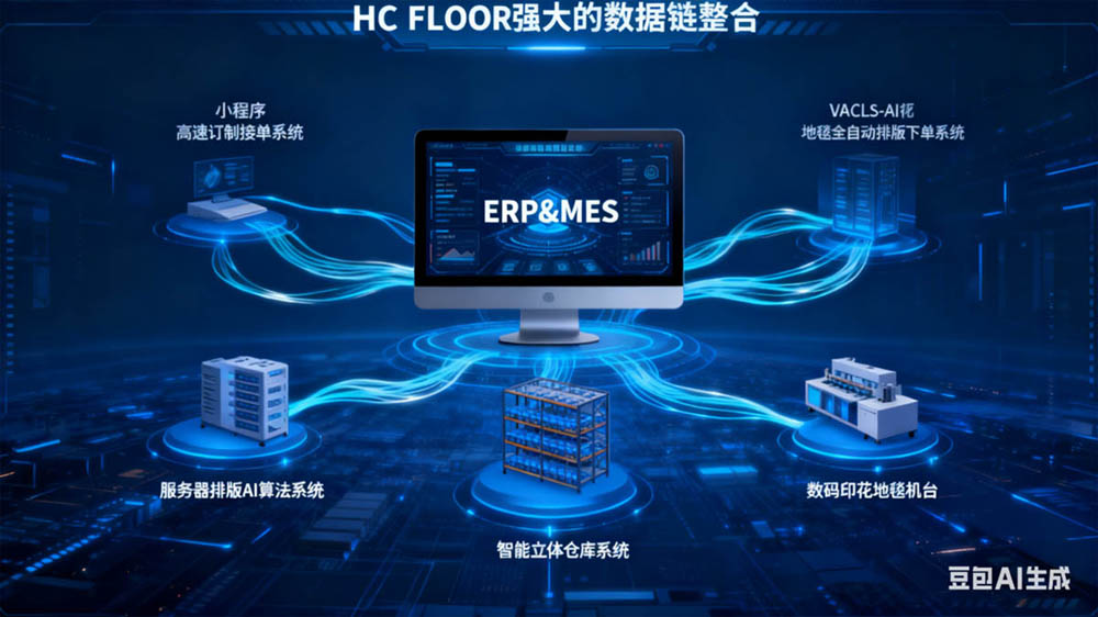鴻成當(dāng)前生產(chǎn)體系,核心原理是依托強(qiáng)大數(shù)據(jù)鏈實(shí)現(xiàn)全域整合。該體系以公司自研的ERP&MES 系統(tǒng)為中樞,串聯(lián)小程序高速訂制接單系統(tǒng)、VACLS-AI 可視化自動(dòng)地毯排版下單系統(tǒng)、服務(wù)器排版算法系統(tǒng)、智能立體倉庫系統(tǒng)及數(shù)據(jù)高清打印系統(tǒng)五大模塊。小程序接單系統(tǒng)與 AI 訂單系統(tǒng)接收訂單后,數(shù)據(jù)鏈將同步服務(wù)器排版算法。排版算法系統(tǒng)會(huì)自動(dòng)生成排版方案、上機(jī)圖、標(biāo)簽數(shù)據(jù)、生產(chǎn)數(shù)據(jù)及包裝數(shù)據(jù),并通過郵件或網(wǎng)頁端自動(dòng)通知客戶。隨后,數(shù)據(jù)鏈將分別傳至機(jī)臺(tái)系統(tǒng)與智能立體倉庫系統(tǒng):倉庫自動(dòng)檢索、調(diào)取所需坯毯,精準(zhǔn)傳送至機(jī)臺(tái)上毯工位;機(jī)臺(tái)系統(tǒng)則自動(dòng)調(diào)用上機(jī)圖完成打印,機(jī)臺(tái)長無需執(zhí)行復(fù)雜操作。打印完成后,系統(tǒng)將指揮成品地毯回存入智能立體倉庫。客戶下達(dá)出運(yùn)指示后,獲授權(quán)發(fā)貨人員在全球任意地點(diǎn)發(fā)送指令,即可觸發(fā)立體倉庫精準(zhǔn)出庫,完成貨物發(fā)運(yùn)。